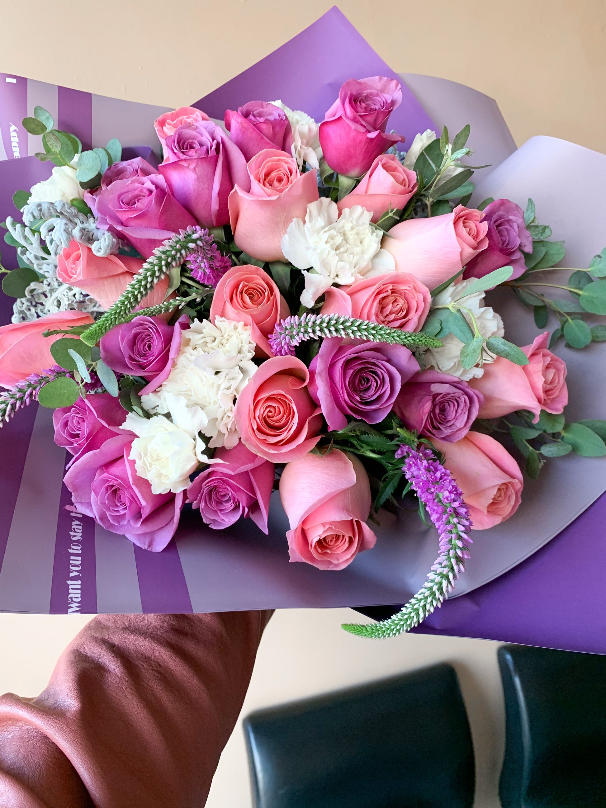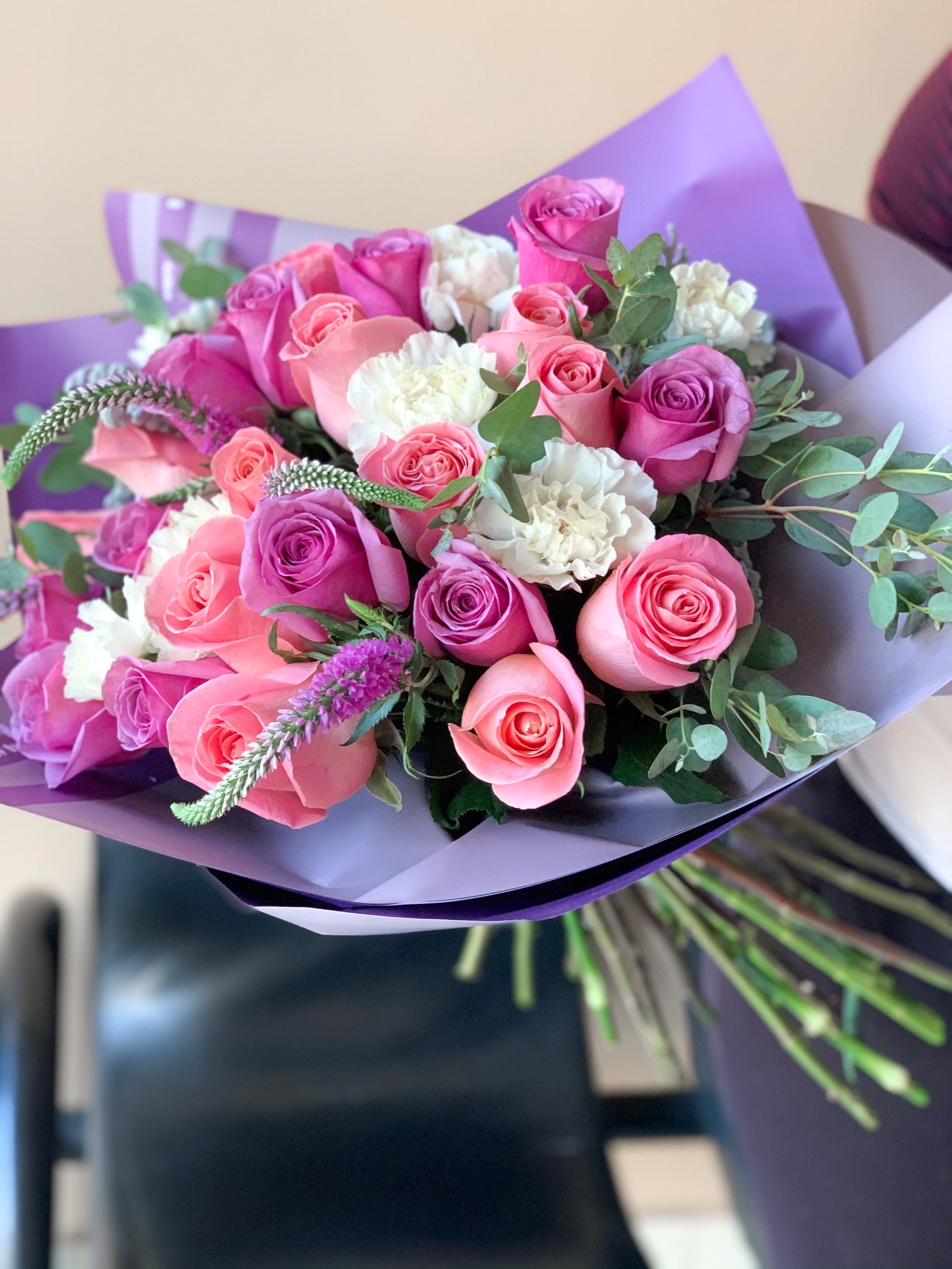 Ramo de rosas claveles y flor veronica en tonos rosa y lila.